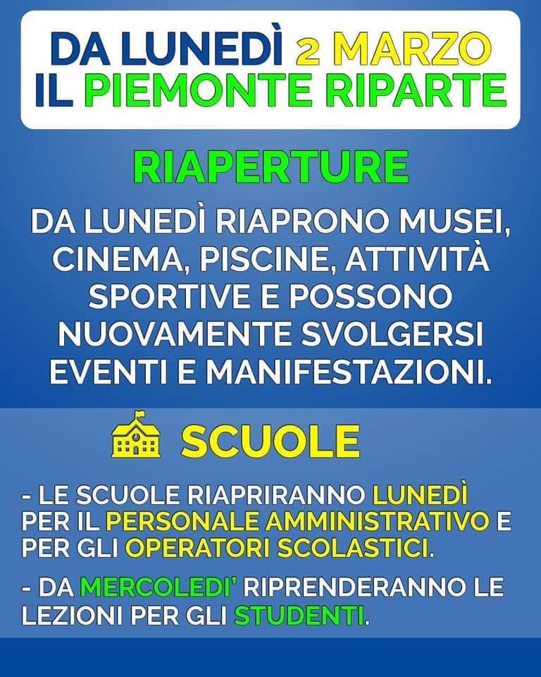 Per le scuole, così come comunicato dalla Segreteria del Presidente della Giunta Regionale, il Piemonte ha adottato una misura autonoma, di concerto con l’Ufficio scolastico regionale e sentiti anche il Presidente del Consiglio e il Ministro della Salute: lunedì e martedì riapriranno gli edifici scolastici al personale per consentire l’organizzazione delle attività e l'igienizzazione delle aule e degli ambienti scolastici. Da mercoledì riprenderanno regolarmente anche le lezioni.