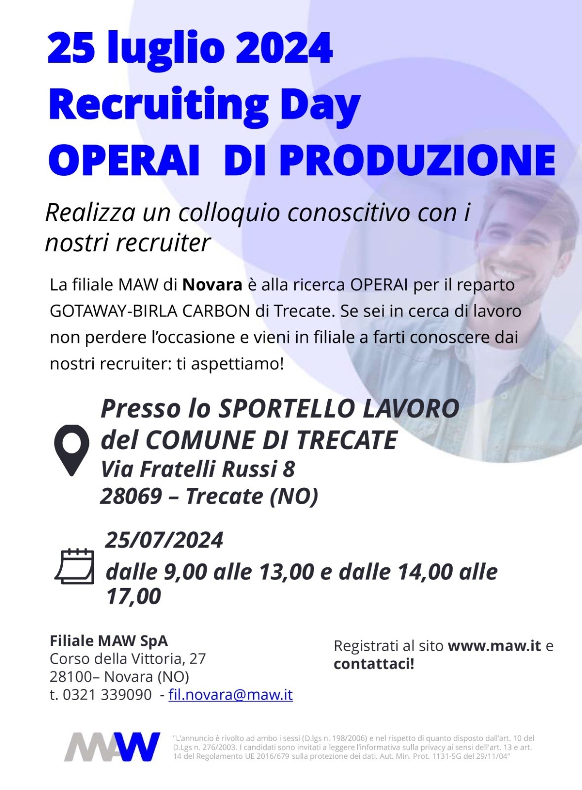 Si pubblica la locandina relativa all'evento in oggetto organizzato dall'agenzia di lavoro MAW per la figura di Operai di Produzione che si terrà presso lo Sportello Lavoro del Comune di Trecate il giorno 25.07.2024 dalle ore 9.00 alle ore 13.00 e dalle ore 14.00 alle ore 17.00.